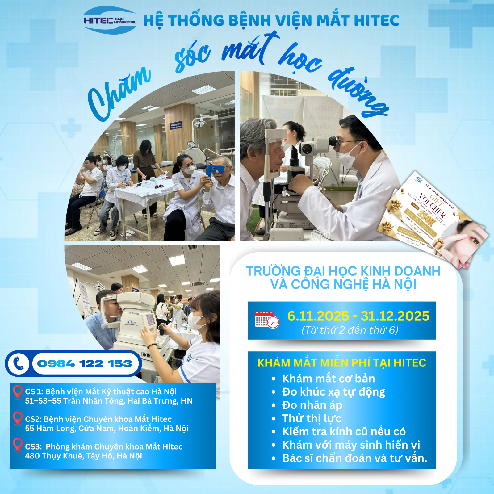 Nhằm nâng cao ý thức chăm sóc và bảo vệ thị lực trong cộng đồng, đặc biệt là giới trẻ và cán bộ giảng dạy, Hệ thống Bệnh viện Mắt Kỹ thuật cao Hitec phối hợp cùng Trường Đại học Kinh doanh và Công nghệ Hà Nội tổ chức chương trình khám mắt miễn phí dành cho toàn thể giảng viên, cán bộ và sinh viên của trường.