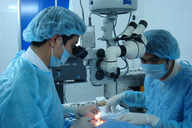 ThS. BS Nguyễn Văn Sanh – Giám đốc hệ thống bệnh viện mắt Hitec và đồng nghiệp thực hiện “Trục vớt” thủy tinh thể cũ để thay thế một thủy tinh thể mới cho người bệnh