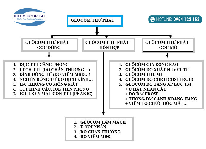 3.2 Glôcôm thứ phát: Xuất hiện sau những rối loạn tại mắt và toàn thân, như Glôcôm do chấn thương, do viêm màng bồ đào, do bệnh lý của thể thuỷ tinh, …