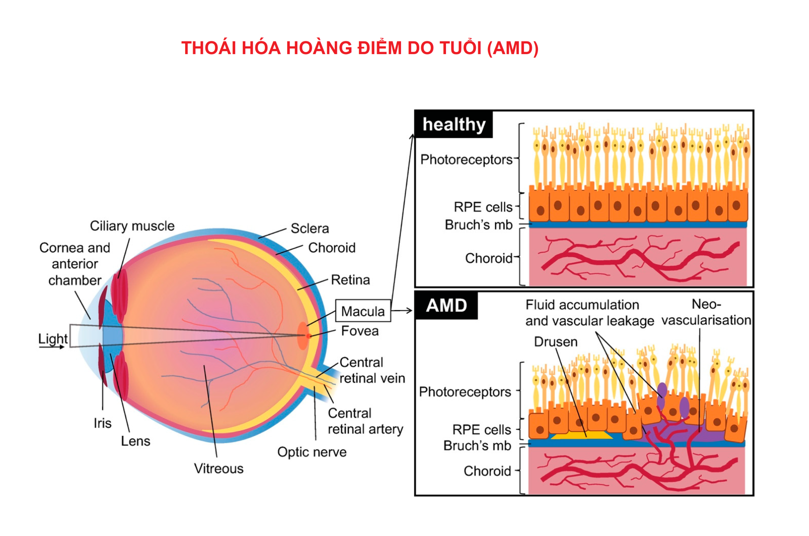 Hình 1. Sơ đồ mắt với tổ chức có các tế bào võng mạc, biểu mô sắc tố võng mạc (RPE) và màng Bruch khỏe mạnh & Ảnh hưởng của bệnh thoái hóa điểm vàng liên quan đến tuổi tác (AMD): cho thấy các RPE bị thoái hóa và tách rời với các RPE chết/chết đặc trưng. Màng Bruch bị tổn thương và quan sát thấy sự tăng sinh tân mạch trong đám rối màng đệm.( sự hiện diện của drusen và tân mạch sớm)