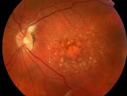 - Thoái hóa hoàng điểm thể ướt hay tân mạch: Tại hoàng điểm có nhiều mạch máu bất thường phát triển làm phá vỡ cấu trúc bình thường của hoàng điểm, gây bong biểu mô sắc tố, xuất huyết võng mạc rồi gây ra một cấu trúc sẹo xơ mạch vùng hoàng điểm gây tổn thị lực nghiêm trọng.