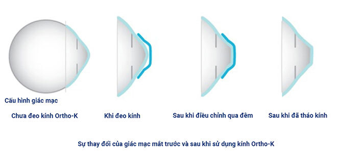 3.2 Kính áp tròng đêm Ortho K Orthokeratology (Ortho-K) được coi là một trong những phương pháp hiệu quả hạn chế tiến triển cận thị. ORTHO - K là một loại kính tiếp xúc cứng đeo vào ban đêm, giúp điều chỉnh bán kính cong của giác mạc khi ngủ. Chỉ cần đeo kính khi ngủ 6-8h liên tục, sáng dậy sẽ có được thị lực tối đa như khi đeo kính gọng mà không cần phải đeo kính suốt cả ngày. Tuy nhiên, để chẩn đoán và có chỉ định đúng để dùng ORTHO - K an toàn và hiệu quả người bệnh cần được trải qua một quy trình khám khúc xạ chuyên sâu bởi bác sỹ nhãn khoa có kinh nghiệm. Người bệnh dùng ORTHO - K cũng cần được theo dõi định kỳ và tuân thủ những hướng dẫn nghiêm ngặt của bác sỹ.