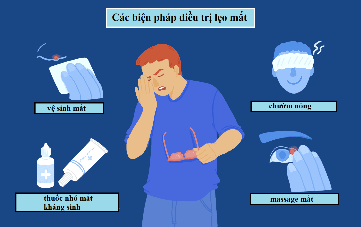 Khi bị nổi mụn lẹo mắt, điều đầu tiên cần bình tĩnh. Không dụi mắt, không tự ý bôi bất kỳ thứ gì lên mắt khiến tình trạng lẹo trầm trọng hơn. Người bệnh tự chăm sóc lẹo mắt tại nhà bằng những cách sau: