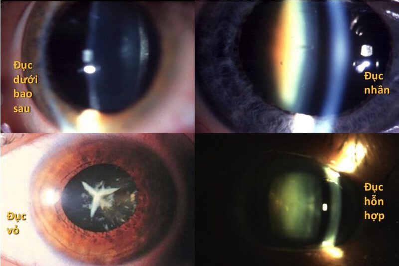 Các hình thái đục thủy tinh thể[/caption] Triệu chứng đục thủy tinh thể có thể không giống nhau do hình thái đục khác nhau. Người bệnh có thể thấy thị lực nhìn xa giảm khi đục thủy tinh thể vùng nhân. Trong khi đó, thị lực nhìn gần có thể vẫn được cải thiện ở giai đoạn đầu do tình trạng "cận thị hóa", vì vậy một số người lão thị bị đục thủy tinh thể có thể giảm số kính hoặc bỏ kính lão tạm thời trong một thời gian ngắn mà vẫn đọc rõ. Đục thủy tinh thể dưới bao sau gây giảm thị lực nhiều hơn khi đồng tử co nhỏ trong điều kiện ánh sáng mạnh, khi nhìn gần để đọc. Đây là hình thái đục thủy tinh thể hay gây mất độ nhạy tương phản và gây chói, lóa, khó phân biệt được màu sắc … đặc biệt là trong điều kiện ánh sáng trời hoặc khi có đèn pha ô tô đi ngược chiều rọi lại. Người bệnh sẽ cảm thấy dễ chịu khi đeo kính mát hoặc trong bóng râm … Ngoài ra, còn có một số triệu chứng khác như nhìn thấy chấm đen hoặc ruồi bay trước mắt cũng có thể là dấu hiệu sớm của bệnh đục thủy tinh thể. Tuy nhiên, đục thủy tinh thể thường tiến triển chậm và chỉ có một dấu hiệu duy nhất là nhìn mờ mà không kèm đau nhức. Nhưng dù đục thủy tinh thể do nguyên nhân gì thì phương pháp điều trị cuối cùng vẫn là thay thế thủy tinh thể đục bằng thủy tinh thể nhân tạo (IOL) với phẫu thuật phaco để phục hồi thị lực và tránh những biến chứng do đục thủy tinh thể gây ra.