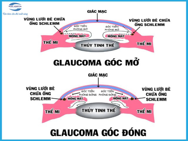Glôcôm nguyên phát có 2 hình thái: góc đóng và góc mở.