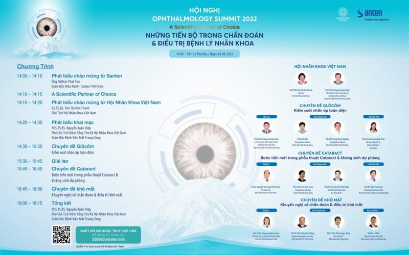 Ngày 20/08/2022 tại Nha Trang, Hội thảo với chủ đề những tiến bộ trong chẩn đoán và điều trị bệnh lý nhãn khoa được tổ chức bởi hội nhãn khoa Việt nam và Santen Nhật bản thu hút sự quan tâm của các bác sĩ nhãn khoa trên toàn quốc. Hội thảo có sự góp mặt của GS.TS Tôn Thị Kim Thanh - Chủ tịch Hội Nhãn khoa Việt Nam, PGS.TS Nguyễn Xuân Hiệp – Giám đốc BV Mắt Trung Ương và các chuyên gia đầu ngành nhãn khoa Việt nam chia sẻ các chuyên đề về glocoma (thiên đầu thống), đục thủy tinh thể, khô mắt. Nội dung các chuyên đề được chia sẻ tại hội thảo