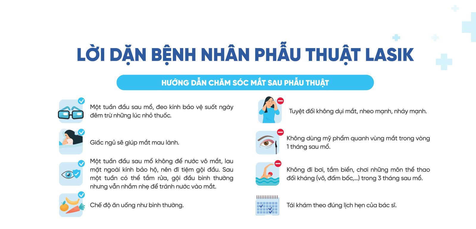 - Không để nước vào mắt, ít nhất một tuần đầu sau mổ. Có thể dùng khăn lau mặt.
