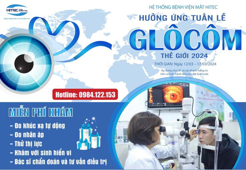 Hưởng ứng tuần lễ Glôcôm Thế Giới, Hệ Thống Bệnh Viện Mắt HITEC thực hiện chương trình “Tặng gói khám mắt cơ bản miễn phí trị giá 250.000 đ cho bệnh nhân có tiền sử mắc bệnh Glôcôm”. Thời gian: Ngày 12/03 – 17/03/2024 Địa chỉ áp dụng khám:
