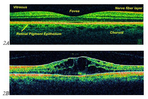 Hình 2: Hình ảnh chụp OCT (A.Hoàng điểm bình thường; B. Hoàng điểm phù do bệnh VM ĐTĐ)