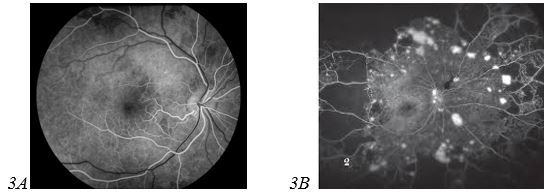 Hình 3: Hình ảnh chụp võng mạc huỳnh quang (A. Bình thường; B. Bệnh VM ĐTĐ)[/caption]