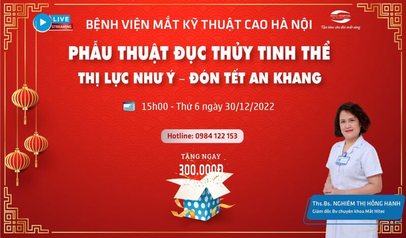 ??? Đón xem livestream lúc 15h00 ngày 30/12/2022 trên fanpage của Bệnh viện Mắt Kỹ Thuật Cao Hà Nội cung cấp đầy đủ thông tin về phương pháp phẫu thuật đục thủy tinh thể được tư vấn chuyên môn từ Chuyên gia nhãn khoa trên 20 năm kinh nghiệm Ths.Bs Nghiêm Thị Hồng Hạnh – Giám đốc Bệnh viện Chuyên Khoa Mắt Hitec. ??