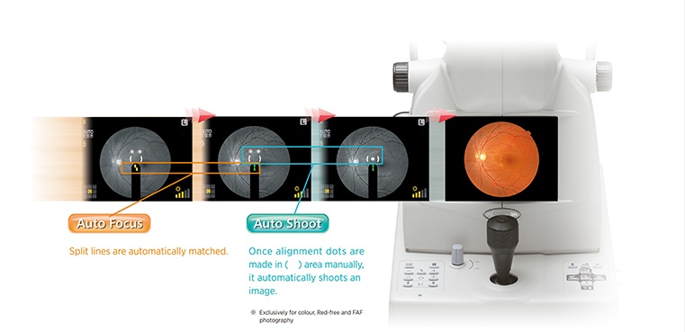 Tự động focus (hội tụ) giúp cho bác sỹ chụp tốt với những trường hợp định vị mắt khó và bệnh nhân ít hợp tác khám bệnh. Chức năng chụp tự động này cho ta tấm ảnh chụp sắc nét mọi lúc.